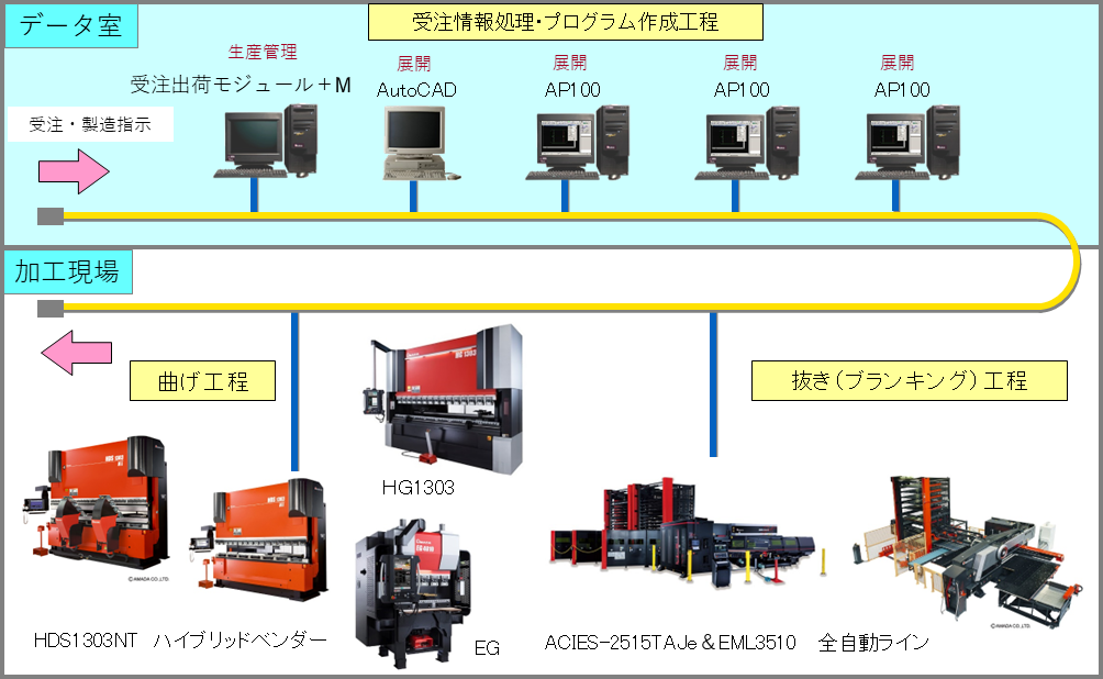 さらに『製品情報』『受注情報』『進捗情報』『作業実績』『出荷済み製品の履歴』などの各データは管理サーバーで一元管理され、それらを基に生産工程における作業負荷の平準化、工程の効率化の分析、納期の短縮化、不良率の低減を図っています。